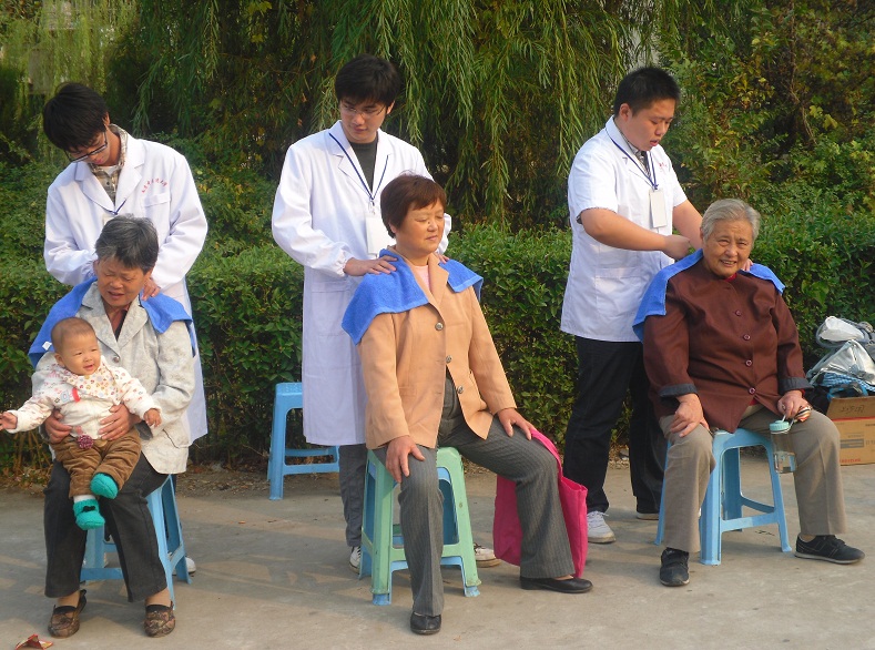 活动刚开始,闻讯而来的居民便被大家的热情与专业所吸引,纷纷前来体验。量血压组中,志愿者们细心捕捉着百姓们的脉声;艾灸组、刮痧组、拔火罐组、推拿组中,居民们尽心享受着志愿者们的技艺;专家组中,骆文宾老师耐心聆听着老人们的病情;还有导医组及药粥药茶组的成员也都在全心全意分别为人们做出详细的导引和提供美味的粥茶。志愿者们在整个义诊过程中一丝不苟,换来了居民离开时满意的微笑。