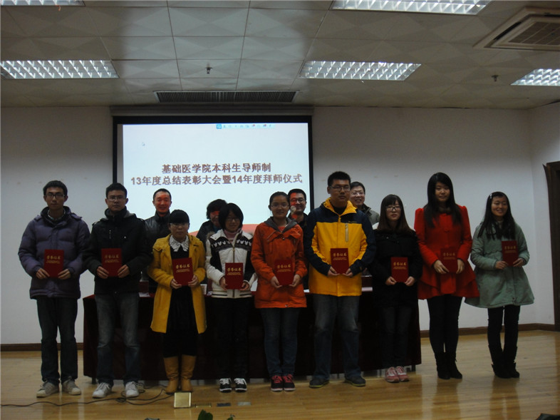孙新新副书记代表学院对所有本科生导师们表示衷心的感谢。王明艳副院长对2013年的本导工作做了总结,在总结中她既肯定了本导工作中效果显著的方面,也指出了不足之处,提出了解决方法。郭胜伟副院长宣读了表彰决定,陈卫平等11位导师及王俊壹等25位同学接受了表彰。表彰结束后举行的是2014年度的拜师仪式,同学们向敬爱的导师们献上鲜花并鞠躬拜师,导师代表中基教研室吴颢昕教授及学员代表王俊壹同学分别发言,吴老师用2个发生在身边的真实故事鼓励大家,是金子总会发光,只要肯努力、肯钻研,一定能找到属于自己的一片天地。