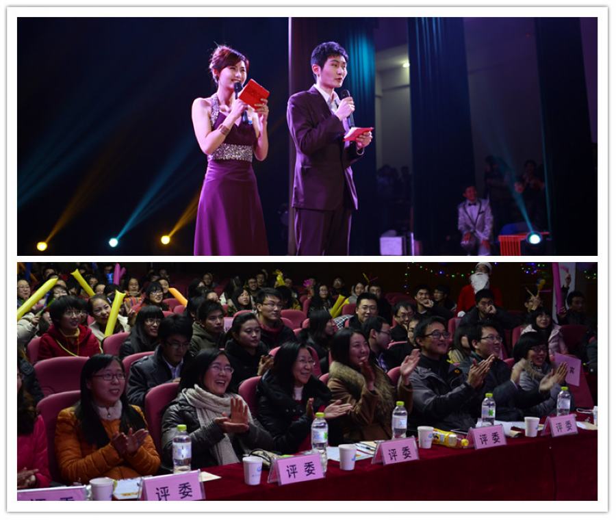 节目进行到了后半程,曾在本科时期举办过个人演唱会的吴坚同学和他的乐队可谓场上表现最亮眼的组合之一,充满张力的表演和轻松自然的互动,使场上气氛达到了顶点,台下的荧光点点和自发打拍,台上的星光熠熠和厚重节奏都使得台上台下融成了一片。曹丛的二胡独奏《赛马》把观众的热情带到了草原,与骏马一起奔腾喜悦。双人舞《locking》干脆帅气,太极古琴表演《云汉歌》沉稳大气,集体舞《玉生烟》柔美轻盈,《茶艺》表演高雅专业。“Jingle bell,Jingle bell,Jingle all the way。。。”圣诞老人和他的可爱小鹿们一起出来提前庆祝圣诞,帅气的一跃,从台上跳到台下,圣诞老人可一点都不“老”,台下观众们也被这活力感染,纷纷站起来涌向圣诞老人,老人的布袋子装满了快乐的糖果,和观众们一起分享这份喜悦。本场晚会的互动环节新奇多样,除了游戏,圣诞专场外还有多次抽奖活动,通过人人墙加油屏的滚动,送出了温馨的冬季礼品,给同学们带去了暖意。这时,一曲悠扬的长笛《我心依旧》让全场凝住神思,静静聆听。最后一个比赛表演是颇具中医院校特色的《武魂》表演,太极拳、金刚拳,动静相间,刚柔并济,灵动有力,形神合一。压轴登场的是尹刚老师的歌曲《你》,尹刚老师的歌慷慨有力、大气磅礴,得到了台下同学们的阵阵掌声和欢呼。此时此刻,全场都沉浸在了这一个个出色的表演中,这已不是一场简单的比赛,它呈现出的统一性与多样性的结合就是一场晚会的精髓,笑声回荡在了小剧场,节日的气氛异常浓烈。