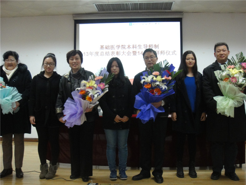 孙新新副书记代表学院对所有本科生导师们表示衷心的感谢。王明艳副院长对2013年的本导工作做了总结,在总结中她既肯定了本导工作中效果显著的方面,也指出了不足之处,提出了解决方法。郭胜伟副院长宣读了表彰决定,陈卫平等11位导师及王俊壹等25位同学接受了表彰。表彰结束后举行的是2014年度的拜师仪式,同学们向敬爱的导师们献上鲜花并鞠躬拜师,导师代表中基教研室吴颢昕教授及学员代表王俊壹同学分别发言,吴老师用2个发生在身边的真实故事鼓励大家,是金子总会发光,只要肯努力、肯钻研,一定能找到属于自己的一片天地。