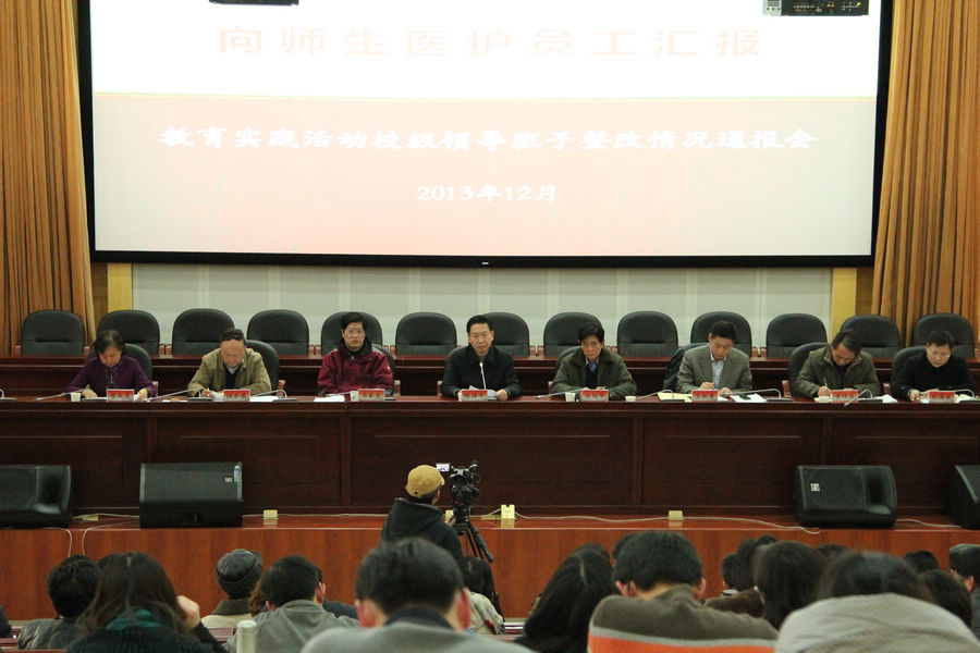 陈涤平书记主持了会议。他开门见山地提出,整改落实、建章立制是教育实践活动的重点和立足点,开展教育实践活动,就是要坚持走群众路线,广泛听取师生医护员工的意见和建议,深入查摆问题,逐项整改落实。他指出,在教育实践活动开始时,校党委即向全校作出承诺,一定要以改进作风、推动工作的实际成效取信于广大师生医护员工。校领导班子选择在2013年的最后一天通报整改情况,让全校师生医护员工了解到我们有些工作已经在整改过程当中,有些通过一段时间努力能够得到解决,有些是长线、长效工作,还需要继续真抓实干、常抓不懈、持之以恒。