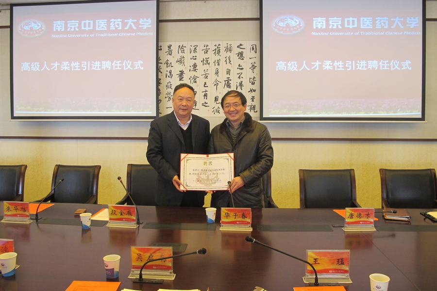仪式由段金廒副校长主持,他宣读了聘任华子春先生为我校兼职教授的决定,代表学校向华子春教授颁发了聘书,并对华子春教授在生命科学领域所取得的成就表示钦佩,并指出华教授的加盟将有利于学校人才培养、学科建设以及科学研究的发展,并将对药学院新专业生物制药专业的建设与顺利验收起到积极的推动作用。华子春教授表达了成为南京中医药大学兼职教授的荣幸之情,并表示自己一定会尽己所能为南京中医药大学的发展尽绵薄之力。最后,人事处、教务处、科技处、研究生院以及药学院领导一致表态,将尽力为华教授提供条件,协助华子春教授在南京中医药大学顺利开展工作。