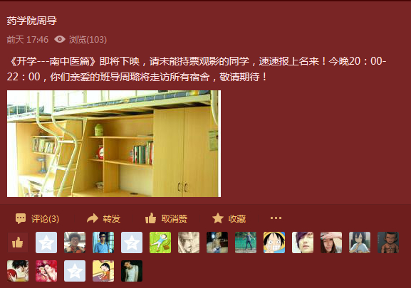 “《开学---南中医篇》即将下映,请未能持票观影的同学,速速报上名来!今晚2000-2200,你们亲爱的班导周璐将走访所有宿舍,敬请期待!”