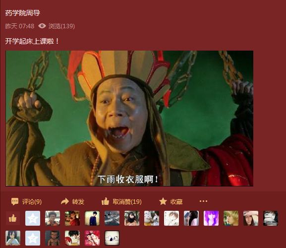 开学第一天,周璐老师通过QQ说说,借用《大话西游》经典桥段,幽默风趣的提醒学生上课。同一天,邀请学业导师严辉老师、辅导员助理葛雅辉,一同给2013级中药资源与开发班展开新学期班会,为学生们分析期末考试、分享寒假见闻、并制定新学期学习和学生工作计划。