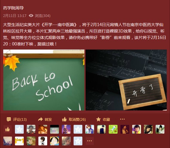 大型生活纪实类大片《开学---南中医篇》,将于214元宵情人节在南京中医药大学仙林校区拉开大幕,本片汇聚各地最强演员,斥巨资打造裸眼3D效果,给你以视觉、听觉、味觉等全方位立体式观影效果,请你务必携带好影券前来观看,该片将于2162000准时下映,莫错过哦!