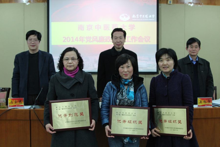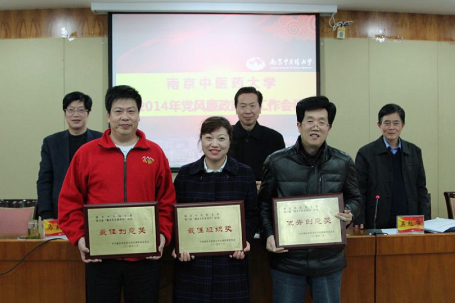 会上,吴勉华校长传达了习近平总书记在十八届中纪委三次全会上的重要讲话精神。校党委马家忠副书记总结了学校2013年纪检监察工作,部署了2014年纪检监察工作任务。吴勉华校长还宣读了《关于表彰第六届廉洁文化进校园活动获奖集体和个人的决定》。陈书记、吴校长、马书记为获奖单位经贸管理学院、药学院、护理学院、第一临床医学院、外国语学院、图书馆分别颁发“最佳创意奖”、“最佳组织奖”和“优秀创意奖”、“优秀组织奖”奖牌。