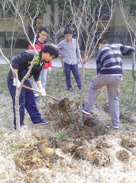 植树节活动开始在微雨初春的午后,后山景行亭畔、敬文图书馆旁、温馨宿管站内无不活跃着同学们和辅导员植树的身影。在后勤技术人员的指导下,大家一起挥锹铲土、取水灌溉,挖坑、起树、移树、种树……尽管土石艰涩难挖、山路泥泞难走,但师生们顾不上裹满裤脚的泥巴、沁满脸颊的汗水,齐心协力,相互帮助,小心翼翼地将移植来的樱花树植入大地母亲的怀抱。