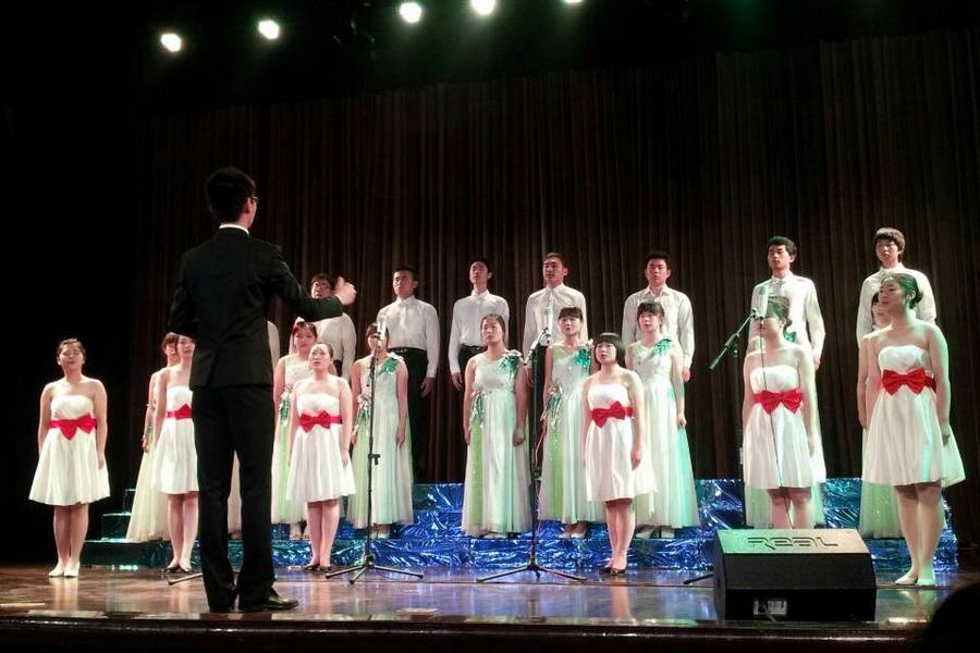 整场歌会演唱形式多样,铿锵有力的男声小合唱、婉转悠扬的女声小合唱、幽默风趣的男声四重唱、轻松欢快的女声三重唱、气势雄浑的混声大合唱将《中国梦》、《把一切献给党》、《隐形的翅膀》、《山楂树》、《深海》等一系列艺术歌曲演绎得精湛完美,演员们投入的表演和深情的演唱赢得了现场观众经久不息的掌声。钟声合唱团的老艺术家们还创新表演形式,在演出过程中穿插了服装模特走秀,看着她们随着音乐的节奏在舞台上自如地走场,范儿十足,全场观众为之感动,掌声欢呼声响彻整个小剧场。大学生艺术团的同学们也演唱了世界名曲《故乡的亲人》、《星星索》。由我校民盟在职支部盟员与合唱团老同志联合表演的混声小合唱,分别用英文、中文、日文唱出了心声《友谊天长地久》,将歌会气氛推到了新的沸点。演出在台上台下师生齐声合唱《同一首歌》的优美旋律中落下帷幕。