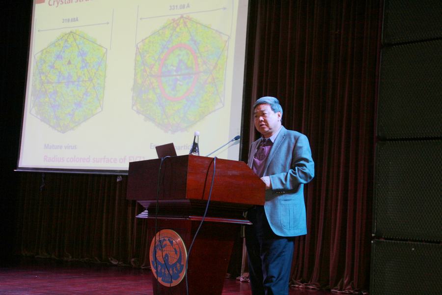 报告会上饶院士首先以幽默风趣的自我介绍作为开场白,引来现场师生的阵阵欢笑和掌声。随后饶院士向大家详细介绍了手足口病毒的形态结构、病毒基因组的释放条件及过程以及以原子坐标等结构为基础的新药研制思路等。整个报告会辅以形象、直观的ppt课件及三维动画演示,将复杂的科学问题加以剖析、简化,使广大师生在抽丝剥茧的分析过程中汲取科学理论,明晰科学思维,提高科学素养。