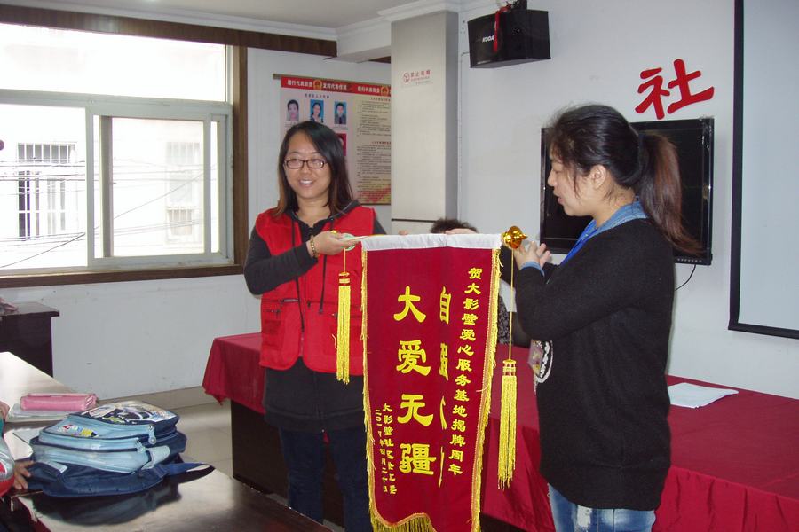 社区尚来友副书记对对建站一年来的的义教活动进行总结和评价,他高度肯定了自强社在大影壁社区的义教工作并表示感谢。自强社志愿服务部部长林晶同学发言,她十分感谢玄武区关工委和社区对自强社的大力支持,感谢大学生志愿者的长期辛勤付出,并呼吁志愿者们发扬公益精神,将这项有意义的爱心活动传承下去。随后,尚书记将赠与自强社的锦旗郑重地交到林晶同学手中,以表感谢之情。为了嘉奖学习认真的孩子,社区领导买了书包作为奖品与自强社同学共同赠送给孩子们,以提高孩子们的学习积极性,社区受教小学生代表对自强社大学生志愿者无私奉献的悉心指导表示感谢!