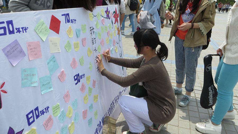 活动前期,基础医学院心协的同学分别找寻不同年代的老师写下了他们对幸福的理解:“幸福就是家人在一起,平平安安”(60年代);“幸福是即使大家很穷,但是相互亲近,互相信任,彼此没有隔阂”(70年代);“幸福是家人健康,工作小有成就”(80年代);“幸福是不断挑战自我,克服困难,收获自信”(90年代)。活动当天,基础医学院心协在一食堂门口将这些幸福展示出来,同时邀请过往同学写下自己身边的小幸福。在同学眼中,能够饱餐一顿是幸福;每天能够陪着闺蜜一起上课一起在宿舍嬉闹是幸福;能够跟恋人一起吃三餐、饭后散步是幸福;每天傍晚跟父母打电话倾诉彼此思念是幸福。心协的同学说:“看着同学们写下一个个小确幸时面庞洋溢着的笑容,其实那便是一种幸福”。