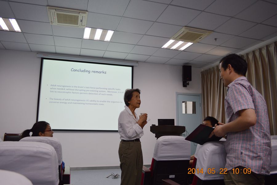 Cheng教授出生于台湾,台湾大学毕业后留学美国,获得布林莫尔学院心理学博士学位,并于宾夕法尼亚大学完成博士后研究。从1969年开始在罗格斯大学任教,1989-1994年担任动物行为中心主任。本次讲座内容主要是有关成年体神经再生和神经营养因子的作用。讲座内容深入浅出,Cheng教授不时停下用中文解释部分关键问题,希望让大家都能听明白。Cheng教授与各位师生积极互动,整场讲座气氛活跃。讲座结束后,Cheng教授还对广大中医学子提出了殷切的希望。