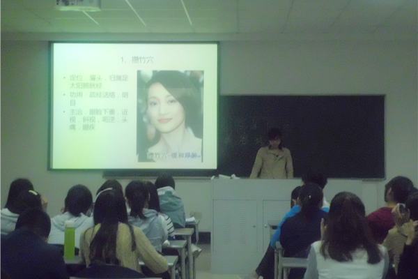 现场气氛热烈,同学们学习兴致颇高。桑维维用PPT的形式为大家展示了面部的基本穴位,使同学们对其有大体的了解,并示范了各种美容按摩手法,让同学们学会了正确的面部清洁方式。在真人演习环节中,桑维维现场给一位女生敷面膜,并亲手调试了一份芦荟面膜给在场的同学们使用。