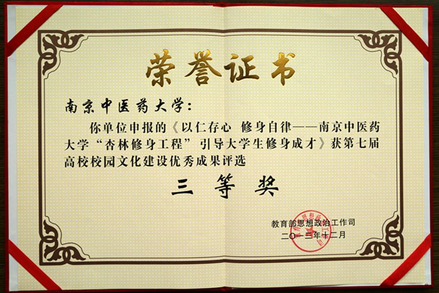 日前,第七届高校校园文化建设优秀成果奖评选结果正式揭晓,我校申报的《以仁存心 修身自律——南京中医药大学“杏林修身工程”引导大学生修身成才》荣获第七届全国高校校园文化建设优秀成果三等奖。