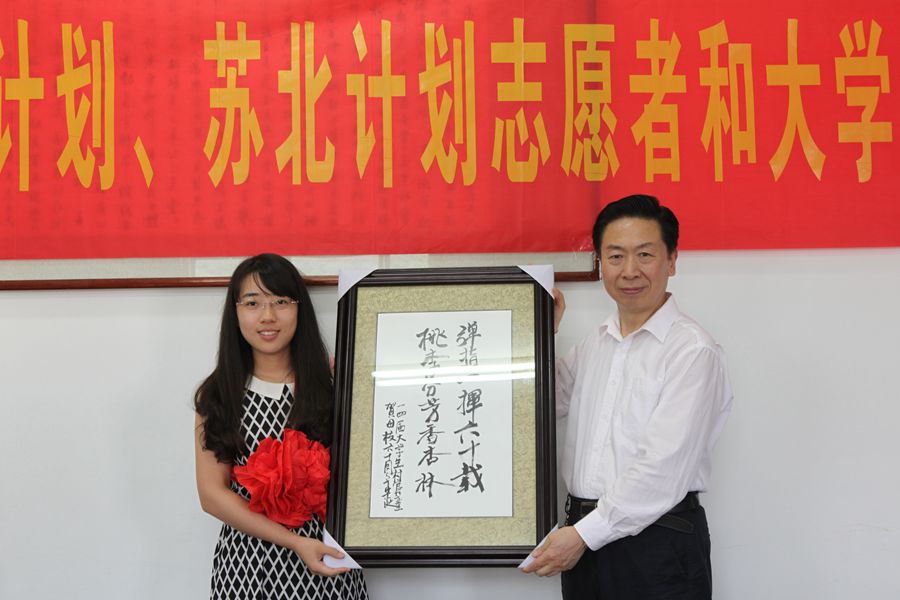 大学生村官代表向学校赠送纪念品