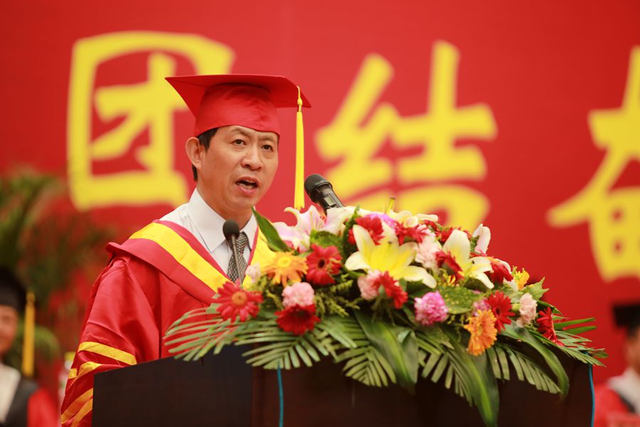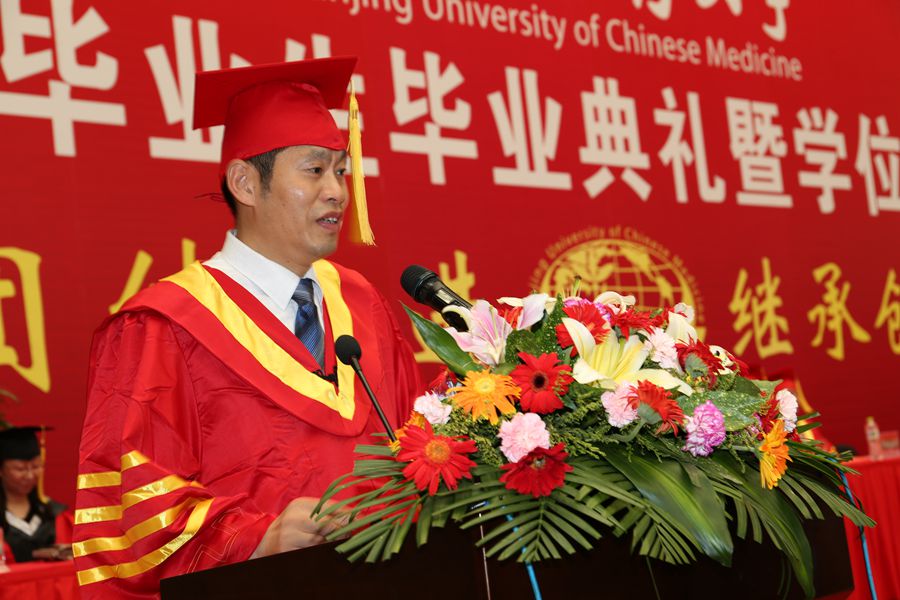 校长、校学位评定委员会主席胡刚教授在仪式上致辞。他向圆满地完成学业并获得学位的研究生表示热烈的祝贺,向辛勤耕耘的导师以及关爱学生成长的亲友表示衷心的感谢,并对毕业研究生未来的工作与生活提出希望:希望他们坚守中医信仰,在中医发展的大好环境下,把握机遇,不断进取;希望他们自强奋进,以科研创新的精神,探究真理、发现新知,追求卓越科学;希望他们乐于奉献,铭记“健康所系、性命相托”的誓言,为人类的健康事业不断奉献。