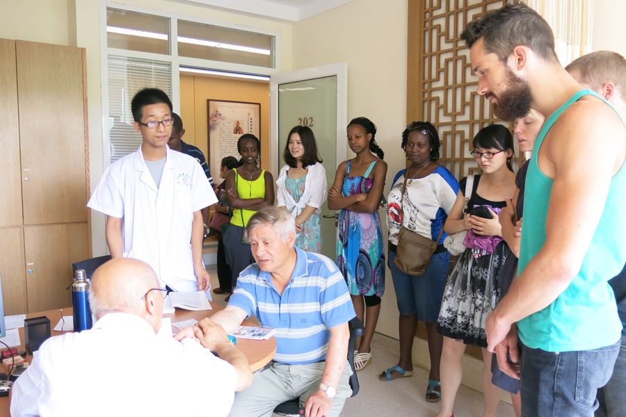 一进门,同学们就被古典气息深深吸引,墙上处处张贴的中医知识画板让他们驻足流连,两位学习中医的同学竟认真讨论起了针灸穴位;随后在中药房,同学们更是目不转睛,抓药、称重、量取,这一切传统手法他们看的饶有兴致;在诊室现场观摩老中医给患者运用四诊进行诊断,让他们在实践层面理解了辨证论治的意义。这样的参观帮助学中医的学生更从理性层面理解中医,也能让学习中国文化的学生从感性层面了解中医。6月初,国际教育学院组织的常州中医文化之旅也是出于这样的目的,使学生们更多领略医家风范、仁心仁术,感知中医文化的渊源,触摸中国文化的脉搏。