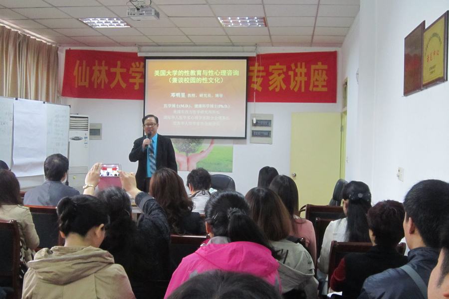 邓明昱博士是中国当代性心理学的开创人之一,在上世纪80年代中期就开始进行人类性学研究和性教育工作,目前,他是世界性健康学会88位注册性学家中唯一的中国大陆背景的专家。邓明昱教授是医学博士(M.D.)、健康科学博士(Ph.D.),美国东西方性学研究所所长、国际华人医学家心理学家联合会理事长、世界华人性学家协会副会长。近三个小时的讲座,邓博士从美国性教育的历史回顾与基本概念、美国大学的性教育课程、美国大学的性心理咨询、美国大学校园的性文化四个方面逐一分析中西方关于性这个话题的区别以及可以相互借鉴的领域。邓博士结合自己从事性心理咨询和性治疗30年的临床经验,介绍了性行为的多元化与心理障碍、性功能障碍、性行为障碍等。内容丰富,包含很多性心理研究成果的新进展。