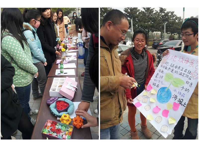 本次主题活动由“废物利用,闪客宣传”和“为地球乞讨”两部分组成。参与本次“废物利用,闪客宣传”活动的参赛选手们带着由瓜子壳、橘络、纸杯等做成的精致花纹杯,各种废纸做成的鲜艳花朵等作品扮演“闪客”,于人群中进行走秀宣传,在短短两分钟的走秀期间,不仅要为自己拉票,还要向观众传播废物利用思想。随后选手们向观众进行作品讲解,观众们对参赛作品进行投票,观众投票时可选作品数量不限,但每个作品只能投一票。投票场面十分热烈,许多观众对参赛作品产生强烈兴趣并积极投票,在近一个小时的投票之后,一等奖、二等奖、三等奖纷纷出炉,2012级中医七年制团支部向获奖同学赠送了小礼品。