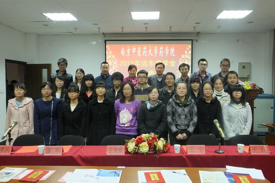 1113中午,南京中医药大学2013年远东奖学金颁奖典礼在药学院会议室顺利举行。远东集团控股有限公司副总经理王宁、三普药业人力资源部总监助理鲍雪凤女士、学工处王治世副处长、研究生院张军副院长、药学院党委王珏副书记、药学院学生工作办公室主任徐钰君老师及2013年远东奖学金获奖学生参加了颁奖典礼。徐钰君老师主持会议。