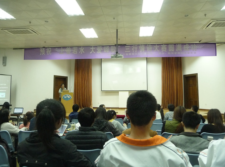518晚,由第二十届青年文化节组委会主办,经贸管理学院分团委、学生会承办的“上善若水,大爱颂歌”三行情诗大赛决赛在大学生活动中心107室顺利举行。