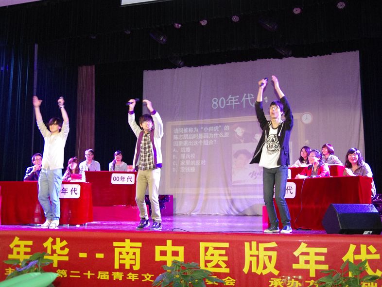 本次比赛由“show time”、“年代问答”、“唱响年代”三个环节组成。第一轮“show time”,70年代一登台就引起了在场观众阵阵呐喊声,精彩的小品、甜蜜的糖果笼络了所有人的心。80年代、90年代、00年代的歌曲演唱各具特色,特别是90年代李乔和周颖的《听海》,假唱与真唱配合得天衣无缝。“年代问答”环节中,选手们回忆过去,积极认真答题,比分你追我赶。话剧《白蛇传》幽默风趣,南中医小虎队的歌曲串烧激情昂扬、歌舞兼并,使观众捧腹大笑。第三轮“唱响年代”,参赛者积极抢答,赛出了自己的风采,在座所有人都给予了他们热烈的掌声。一首由2011级中西医临床2班全体同学共同演绎的歌曲《没有什么不同》给活动画上了圆满的句号。最终,80年代的邹妙笛和孔文文以及00年代的吴一鑫和孙青将冠军收入囊中,90年代的李乔和周颖,70年代的张绮和程悦分别获得第二、第三名。