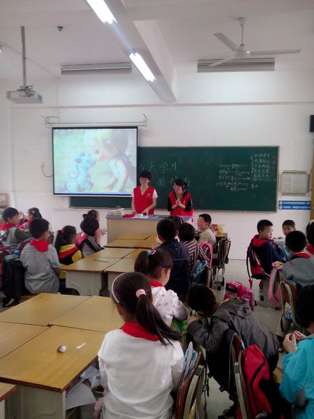 北京东路小学的师生们对志愿者们的到来表达了热烈的欢迎。活动伊始,简单的几个互动小游戏拉近了大家与小朋友们的距离,气氛活跃起来。志愿者们给小朋友们讲解了当前应该注意的日常健康行为知识和疾病预防知识,并介绍了一些简单的中医养生常识。在讲解的同时同学们还配合播放了精心制作的多媒体课件,丰富的内容、直观的形象,增进了小朋友们对所聆听内容的理解,大家听得十分认真,专注的眼神传达出对知识的渴望。志愿者们随后根据讲课内容设计了一些问题,小朋友们积极举手,争先发言。