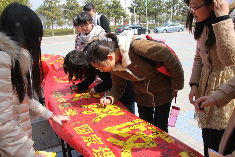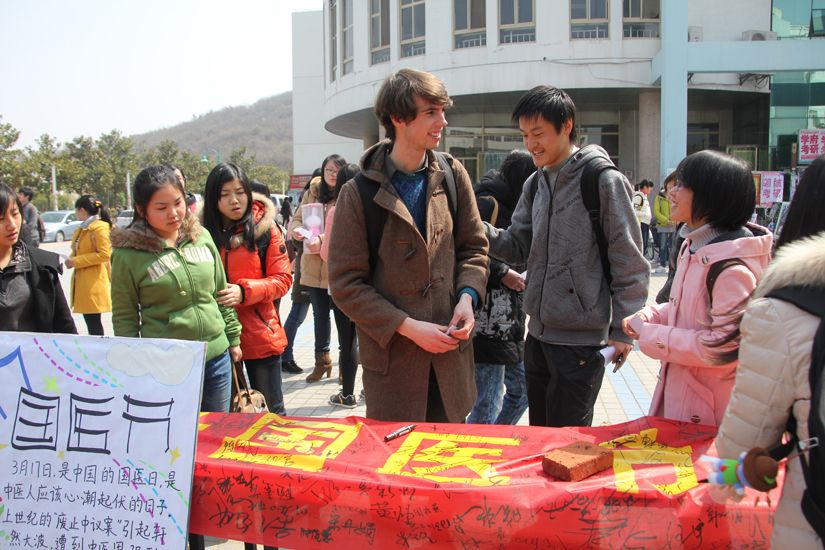 活动伊始,同学们就积极为来往同学介绍国医节的来历以及分发传单,鼓励大家在横幅上留下自己的名字,而外国友人也积极参与为活动增添了一份色彩。活动过程中,慕名而至的同学络绎不绝,一个个签名挤满了横幅。