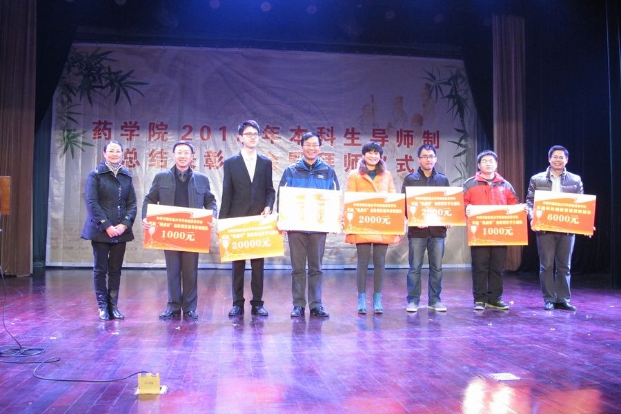药学院副院长陈蕾宣读了《关于表彰2011-2012学年药学院本科生导师制“优秀指导老师”、“优秀培养对象”、“优秀学习团队”的决定》,校院部分领导为获奖教师、学生代表颁奖。为了表彰药学院师生近年来在大学生科技创新方面所取得的成绩,鼓励药学院广大师生更加踊跃积极的参与大学生科技创新活动,中药学国家重点学科和省优势学科拿出5.2万元奖励给2011-2012年在国家、省级挑战杯中获得奖项的教师和学生及管理保障团队,吴皓院长为获得奖励的师生颁发了奖金。优秀本科生导师代表彭国平教授教授在总结会上作了交流发言。