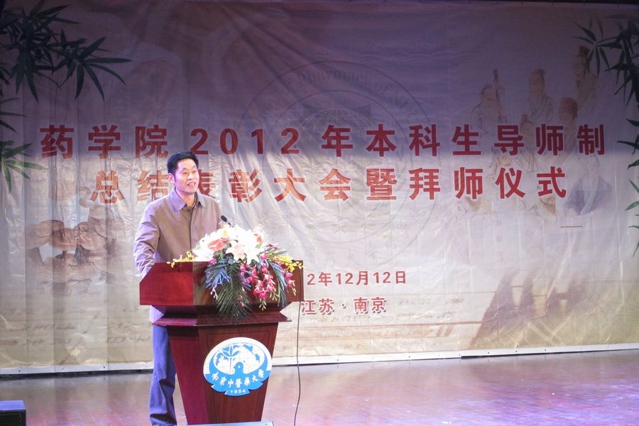 校党委副书记、副校长王长青作了重要讲话,他高度评价了药学院的各项工作,充分肯定了药学院本科生导师制工作和大学生科技创新工作。他简要的追溯了大学功能的变迁历史,强调“人才培养”始终是高校的核心任务和功能,期望广大导师充分认识到这一点,重视本科生的教育培养,注重学生的个性化教育,做引领本科生走向成才成功的“导师”,并进一步向本导师培养对象提出“五个学会”的要求,并且希望他们抓住机遇,珍惜机会,积极认真的向导师求教,加强创新、创优方面的学习,为祖国医药传承、发展作出贡献!