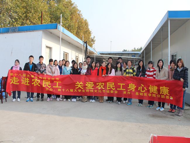 由第十八届大学生科技文化节组委会主办,基础医学院分团委承办的“第十八届科技文化节之走进农民工,关爱农民工身心健康”活动于