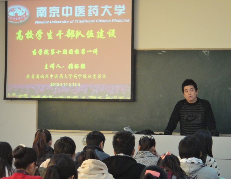 20121113下午,药学院第十期团校在B1-205教室举行了第一场理论讲座,由第一临床医学院分团委书记张裕强老师讲授“高校学生干部队伍建设的理论与实践”。