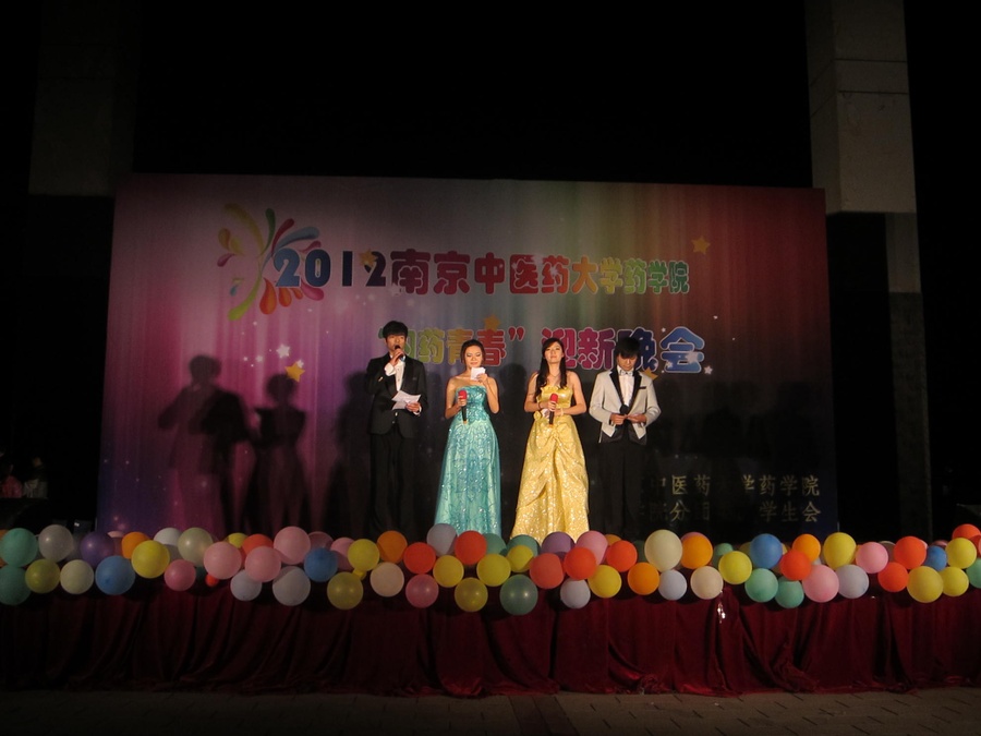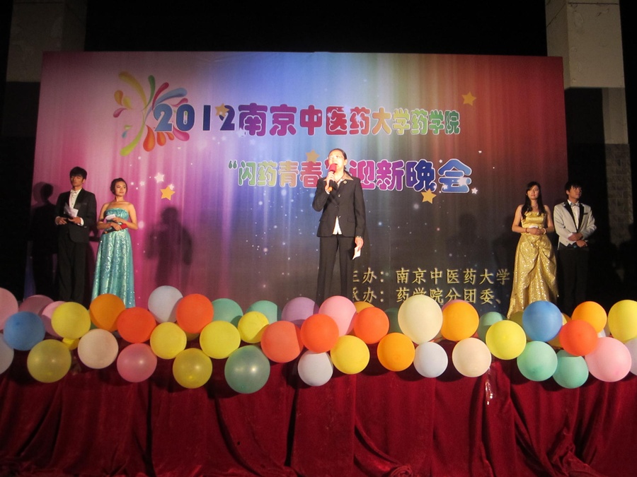 20121028晚,由药学院分团委、学生会主办的2012药学院迎新晚会在逸夫广场拉开帷幕。晚会以“闪药青春”为主题,寄予了药学院全体师生对新生的殷殷期望。药学院院长吴皓,药学院分党委副书记、副院长王珏,副院长陈蕾、陈建伟出席了晚会,药学院2012级全体辅导员携新生参加了晚会。