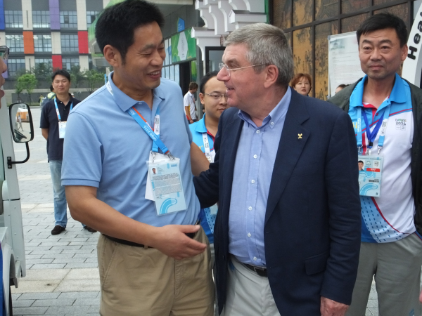 慰问临近结束时,曾两次亲临体验音乐减压小屋的国际奥委会巴赫主席再次来到青奥村,见到王书记时两人亲切交谈,巴赫主席对项目再次给予高度肯定,他向王书记赞叹到,“您学校的音乐减压项目非常有中国特色,我很喜欢,您一定非常为您的团队感到骄傲!”