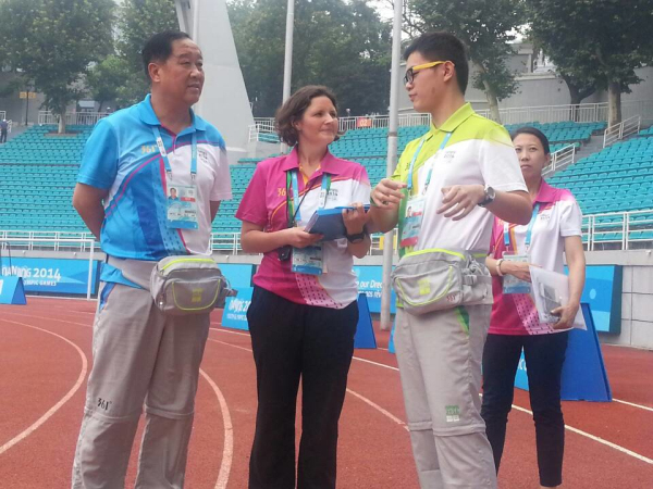 戴新老师(左一)与足球项目(FIFA)的国际裁判在场地巡查