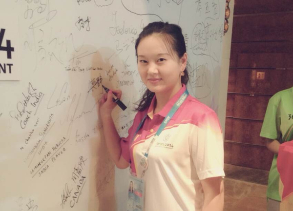 樊静老师在青奥会武术项目欢迎招待会的签名墙签名留影