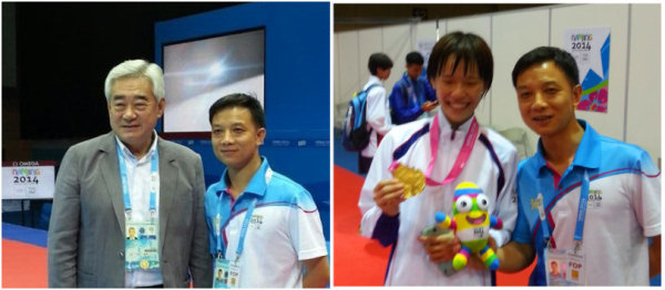 姚焱兵老师(左图右)与世界跆拳道联合会主席合影、与金牌选手中华台北黄怀萱(右图左)合影