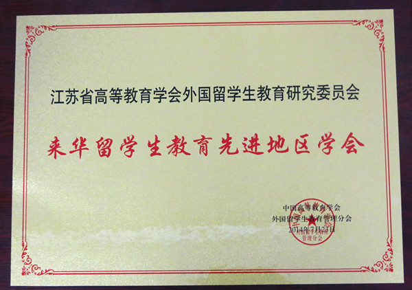 暑假期间,在中国高等教育学会外国留学生教育管理分会2014年学术年会上,对全国教育系统来华留学生教育工作进行了表彰。我校被评为“来华留学生教育先进集体”,江苏省外国留学生教育研究会获得“来华留学生教育先进地区学会”荣誉称号。
