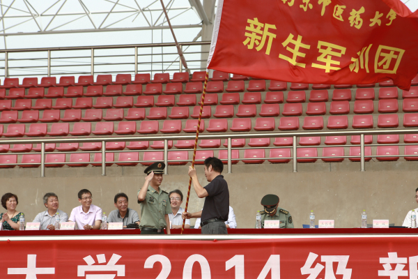 大会首先宣读了《关于组建南京中医药大学2014级学生军训团的通知》,随后,王长青副书记向军训团团长应栋中校授团旗。应栋团长挥舞团旗,全场致以热烈的掌声,标志着南京中医药大学2014级新生军训工作正式拉开帷幕。