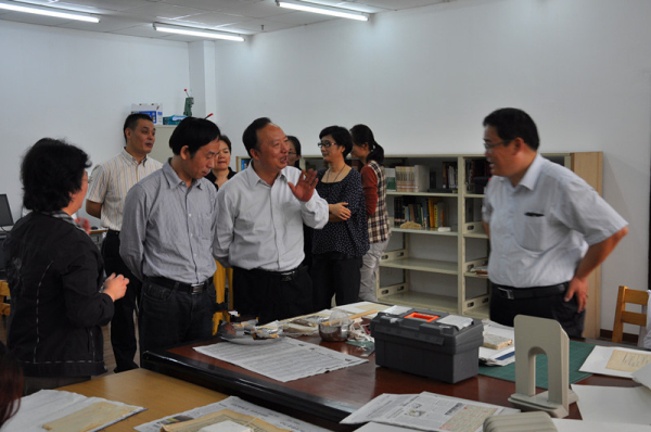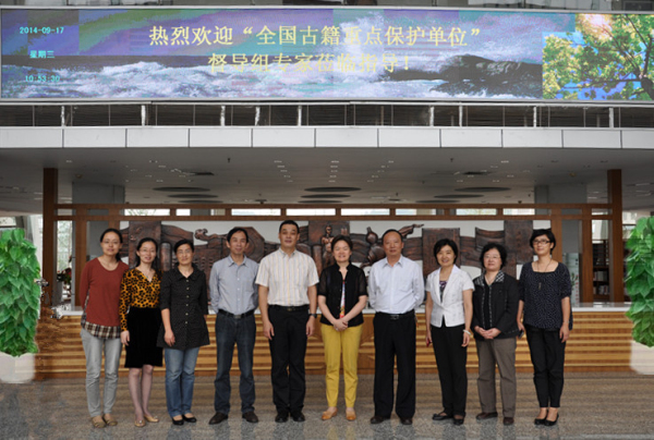 9月17日上午,由江苏省文化厅组织的专家组来到我校图书馆督查古籍保护与利用工作。检查组专家由江苏省文化厅公共文化处王健处长、南京师范大学图书馆张建平常务副馆长、南京大学古典文献研究所所长程章灿教授、南京图书馆历史文献部副研究馆员徐昕等组成,曾莉副校长出席并陪同检查。