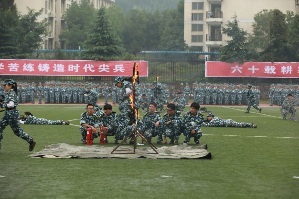 为了庆贺学校即将到来的60周年校庆,在成果汇报过程中,由匕首操方队的215名受训同学摆出两个“六十”字样的队形,谨以此献礼今年10月15日学校的60周年校庆。