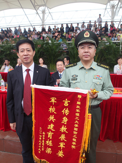军训汇报表演结束后,南京中医药大学校长胡刚教授向解放军理工大学国防工程学院副政委沈亚健大校赠送了锦旗。