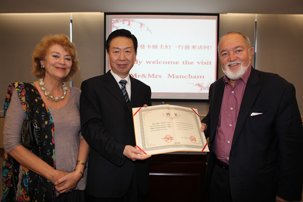 陈涤平书记代表学校聘请詹姆斯•曼卡姆先生担任我校董事会名誉董事长
