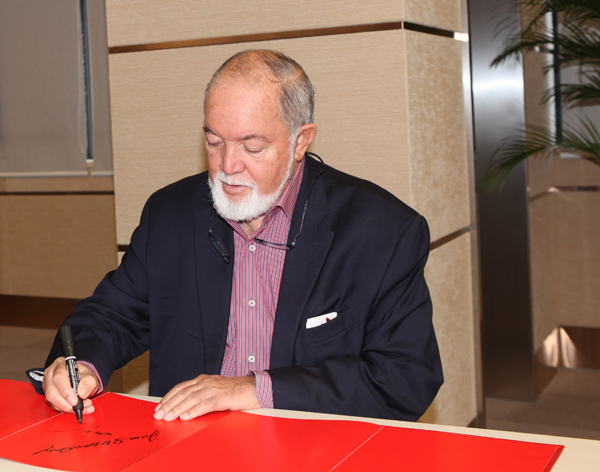 最后,詹姆斯·曼卡姆先生为我校60周年校庆签名祝贺,宾主双方互赠了纪念品,并就下一步的合作与交流进行了接洽。