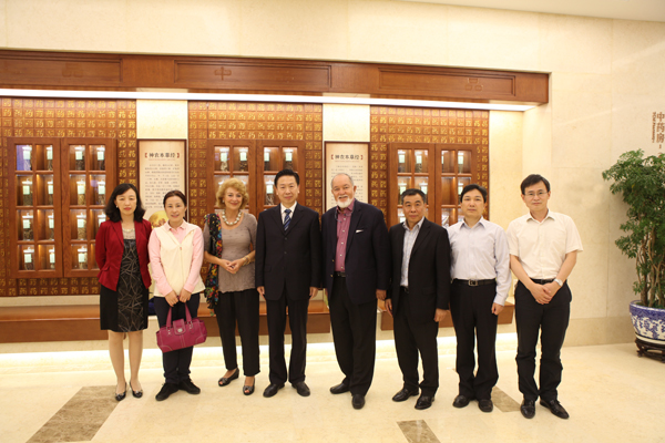 会见在学校汉中门校区国医堂5楼会议室举行,在会谈正式开始前,陈涤平书记邀请詹姆斯·曼卡姆夫妇一行品尝了学校制作的特色保健药茶,并向夫妇二人介绍了塞舌尔群岛上盛产的几味中草药的功效和特点。随后,会谈正式开始,陈书记首先代表学校全体师生医护员工对詹姆斯·曼卡姆夫妇一行的来访表示热烈的欢迎,他向来宾简要介绍了学校在我国中医药高等教育历史中的地位以及做出的重要贡献,着重阐述了中医药的基本理念以及与当代世界范围内健康观念的联系和共同点,希望能够与詹姆斯·曼卡姆夫妇共同努力,把我国的中医药事业进一步推向国际,为人类的健康作出更大的贡献。陈涤平书记还代表学校董事会正式邀请詹姆斯·曼卡姆先生担任我校董事会名誉董事长。