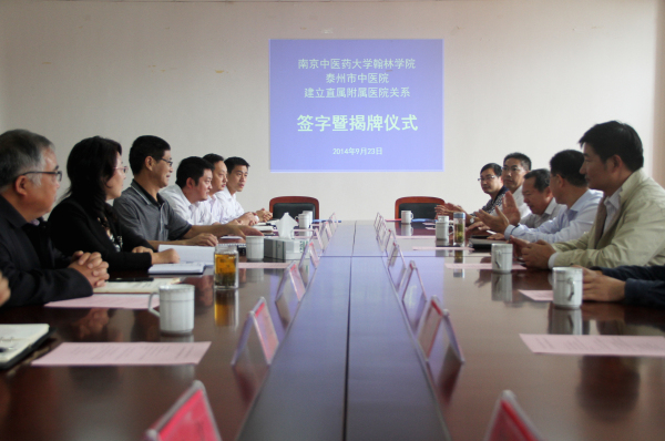 9月23日上午,南京中医药大学翰林学院与泰州市中医院建立直属附属医院关系签字暨揭牌仪式在翰林学院501会议室举行。南京中医药大学副校长徐桂华、教务处副处长徐俊良,泰州市卫生局局长徐洪涛、翰林学院院长沈大庆、党委书记唐传俭、泰州市中医院院长毛跃以及泰州市卫生局、泰州市中医院、翰林学院职能部门负责人出席揭牌仪式。唐传俭书记主持仪式。