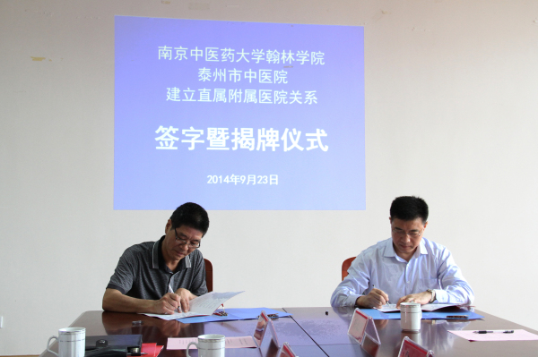 9月23日上午,南京中医药大学翰林学院与泰州市中医院建立直属附属医院关系签字暨揭牌仪式在翰林学院501会议室举行。南京中医药大学副校长徐桂华、教务处副处长徐俊良,泰州市卫生局局长徐洪涛、翰林学院院长沈大庆、党委书记唐传俭、泰州市中医院院长毛跃以及泰州市卫生局、泰州市中医院、翰林学院职能部门负责人出席揭牌仪式。唐传俭书记主持仪式。