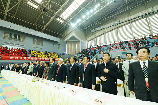 全体校领导登台与来宾、全体师生同唱校歌