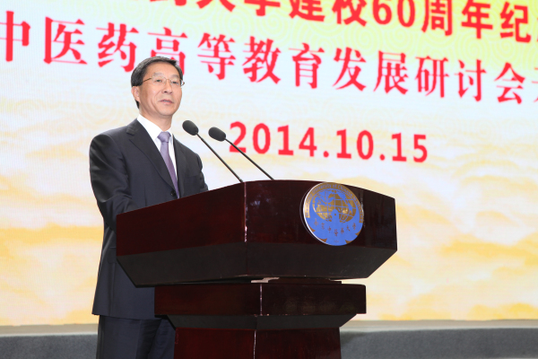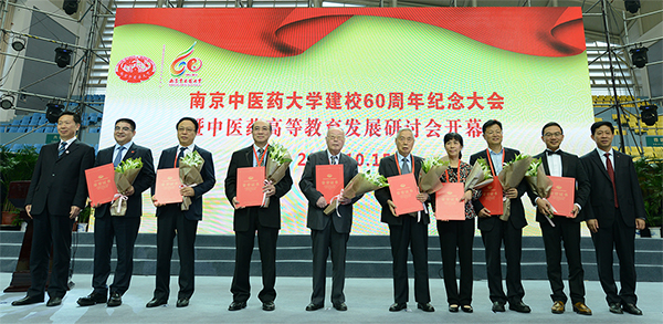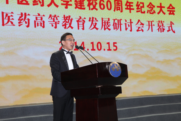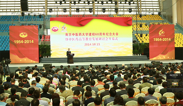 2014年10月15日,南京中医药大学建校60周年纪念大会暨中医药高等教育发展论坛开幕式在南京中医药大学仙林校区体育馆隆重召开。江苏省人民政府副省长曹卫星、中国工程院副院长、南京中医药大学荣誉教授樊代明院士、原卫生部副部长朱庆生、国家中医药管理局副局长王志勇、原江苏省人民政府常务副省长俞兴德、原江苏省人民政府副省长李全林、原江苏省政协副主席周珉等领导及海内外各界嘉宾、师生校友代表约2000余人参加了大会。江苏省委书记罗志军、江苏省政协主席张连珍、世界卫生组织传统医学部主任张奇、美国国际合作委员会主席陈香梅女士、解放军南京军区联勤部、北京中医药大学等发来贺信。大会由南京中医药大学党委书记陈涤平主持。