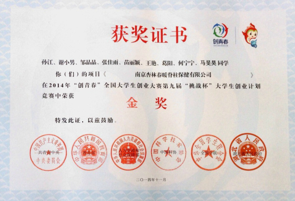 我校《南京杏林春暖脊柱保健有限公司》创业项目获得金奖